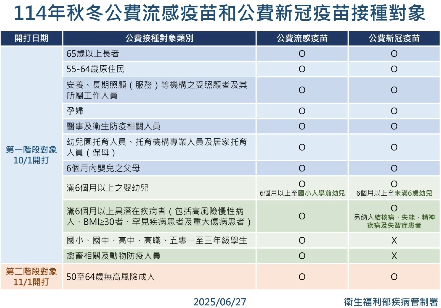 一、本(114)年公費流感、新冠疫苗自10月1日起同時開打,依實施對象分為兩階段施打;凡符合各實施階段之公費對象,可持健保卡及相關證明文件(如:重大傷病/罕見疾病、高風險慢性病等診斷、醫事人員執業執照、在職證明、六個月以下嬰兒父母請攜帶戶口名簿等),可前來本院接種疫苗!
